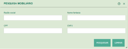 Para realizar uma pesquisa deve-se selecionar o ícone Pesquisar do menu Mobiliário. Esta ação fará com que uma janela de texto apareça na tela com os seguintes campos de consulta: Razão Social e Nome Fantasia, CNPJ, CPF e Bairro. Após o preenchimento de um dos campos de interesse deve-se clicar no botão Pesquisar.
