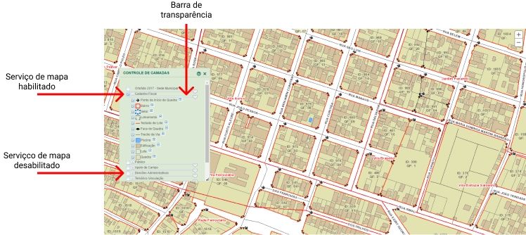 Adicionalmente, o Controle de Camadas possui recurso que fornece transparência às camadas ativas de um Serviço de Mapa, tornando-o mais transparente com relação a outras camadas habilitadas no mapa. A barra de transparência, na forma de um botão deslizante, fica localizada imediatamente abaixo do nome do Serviço de Mapa. Por padrão os Serviços de Mapas são carregados sem transparência.