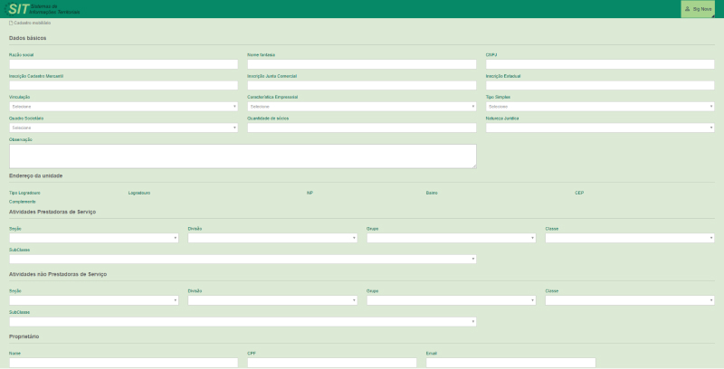 A maioria dos campos possuem combo com opções de preenchimento, é o caso do CNAE, composição, tipo unidade fiscal mobiliária, Pessoa e Tipo pessoa. Nos demais campo é necessário realizar o preenchimento manualmente.