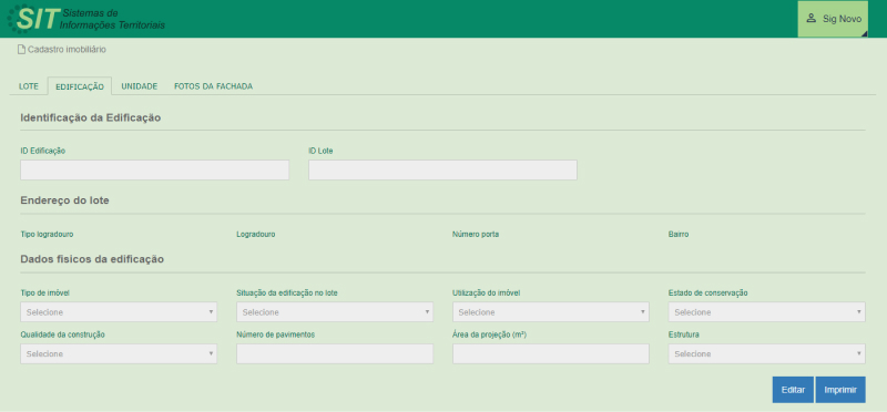 Tela para consulta e edição dos dados da edificação (construção). Está organizado em 3 blocos: