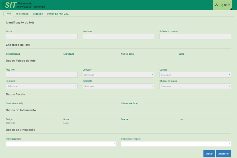 Tela para consulta e edição dos dados dos lotes (terrenos). Está organizado em 6 blocos:
