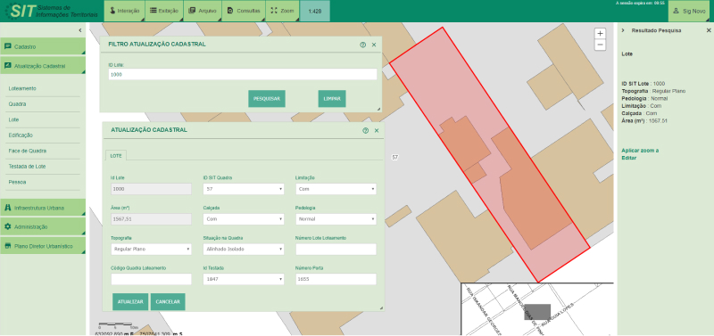 A janela Resultado Pesquisa apresenta as principais informações do elemento pesquisado, além dos botões “Aplicar zoom a” e ”Editar”. Clicando sobre o botão “Aplicar zoom a” o sistema irá processar de forma a enquadrar e centralizar o elemento consultado na tela. O botão “Editar” irá processar e exibir janela contendo os dados tabulares de edição do lote. Com exceção do campo “id lote” que fica desabilitado para edição os demais campos podem ser editados. Ao final da operação deve-se acionar o comando “Atualizar” para salvar as alterações realizadas.