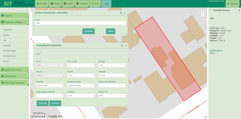 Acionando o menu Loteamento o sistema irá exibir a janela Filtro Atualização Cadastral com a opção de consulta por “ID Loteamento”. O comando Pesquisar realiza a busca no banco de dados exibindo o resultado da consulta na janela Resultado Pesquisa, localizado na lateral esquerda da tela, ao mesmo tempo em que o evidencia no mapa (polígono vermelho).