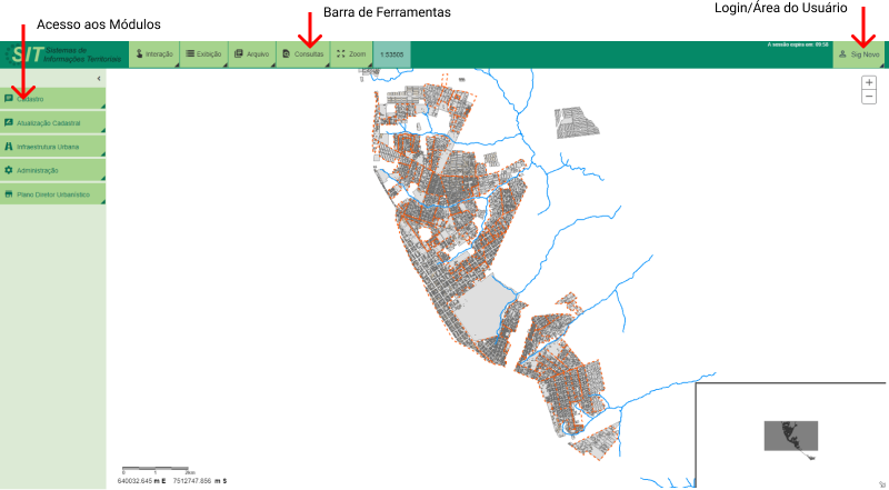 A Navegação e Consulta Básica corresponde ao conjunto de elementos do sistema que possibilita o uso e navegação pelo SIT como visualizar mapas e informações, realizar consultas, navegar pelo Street View entre outras atividades de uso geral. É composta pela Barra de Ferramentas, pelo mapa georreferenciado e elementos de mapas tais como botões de zoom, overview, escala gráfica, entre outros.