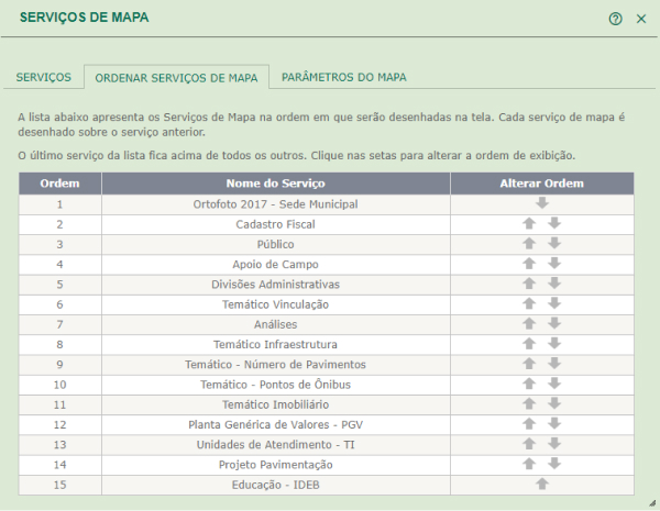 Esta funcionalidade atua apenas sobre os serviços de mapas que estão vinculadas ao Controle de Camadas. Para ordenar a lista de serviços de mapas deve-se clicar sobre as setas localizadas à direita de cada serviço.