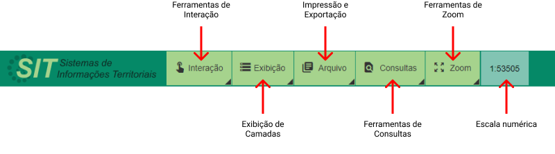 •Coordenadas geográficas: localizado no canto inferior esquerdo da tela. Exibe as coordenadas latitude/longitude em unidades métricas (UTM). Esta sincronizado com o ponteiro do mouse, ou seja, à medida que o mouse é movimentado sobre o mapa as coordenadas vão sendo automaticamente atualizadas.