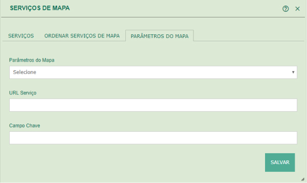 Esta funcionalidade tem por objetivo possibilitar a edição de serviços de mapa que atuam em ações do sistema como consultas de dados e impressões. É composta por três campos principais: