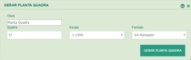 Para gerar uma Planta Quadra deve-se preencher os campos de Distrito/Zona/Quadra, selecionar uma escala de impressão na lista de escalas e um formato de saída do documento. Os layouts de saída estão configurados em A4 Paisagem, A4 Retrato, A3 e A1.